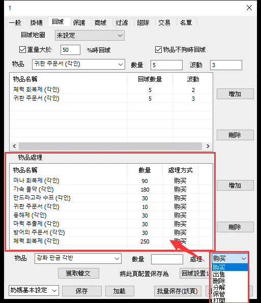 下欄才是回城後對物品的處理(購買、出售、刪除、分解、保管、打開都是在這一欄設定)